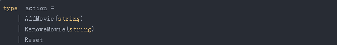 这意味着具备类型 action 的任何变量都可以具备以下值之一:Reset、带有少量字符串值的 AddMovie 和带有少量字符串值的 RemoveMovie。