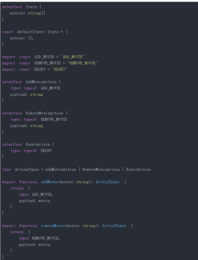 没什么特别的,我们公告了状态界面、默认状态、动作、动作创立者以及最后的 Reducer。