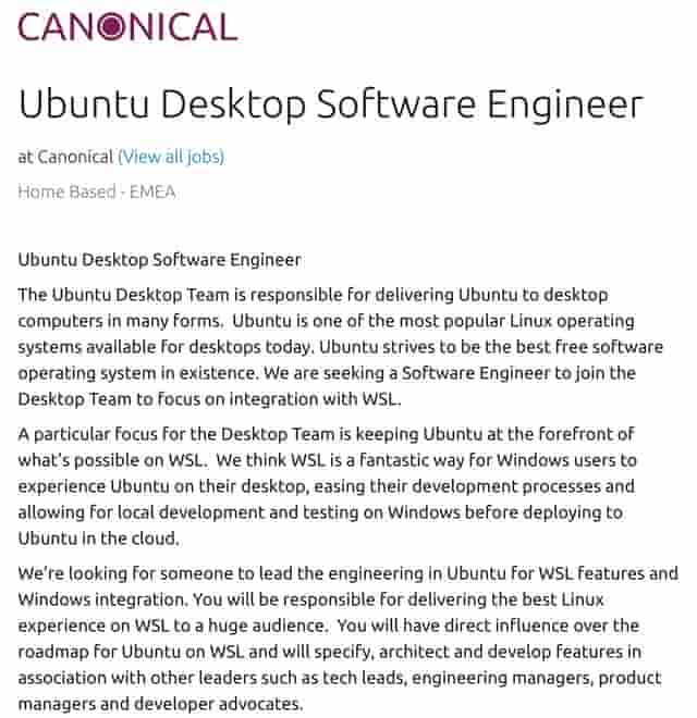 在 Ubuntu 桌面软件工程师的招聘声明中,Canonical 表示其正在寻觅可以将 Ubuntu 领导到 WSL 领先地位的人,“我们认为 WSL 是 Windows 客户在台式机上体验 Ubuntu,简化其开发流程并允许在 Windows 上进行本地开发和测试而后再部署到云中的 Ubuntu 之前的一种绝佳方式。”