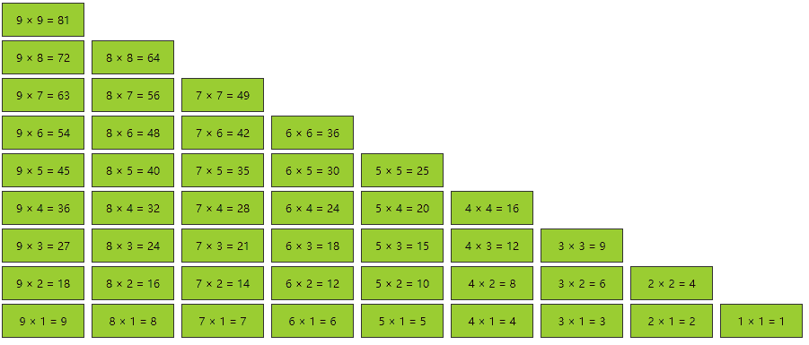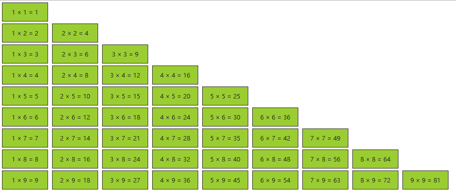 <html><style> html,body,ul,li { padding: 0; margin: 0; border: 0; }ul { width: 900px; overflow: hidden; margin-top: 4px; font-size: 12px; line-height: 36px;}li { float: left; width: 90px; margin: 0 4px; display: inline-block; text-align: center; border: 1px solid #333; background:yellowgreen; }</style><body></body><script> for(let i = 1; i <= 9; i++){ let myUl = document.createElement('ul'); for(let j = 1; j <= i; j++){ let myLi = document.createElement('li'); let myText = document.createTextNode(j + " × " + i + " = " + i*j); myLi.appendChild(myText); myUl.appendChild(myLi); } document.getElementsByTagName('body')[0].appendChild(myUl);}</script></html>