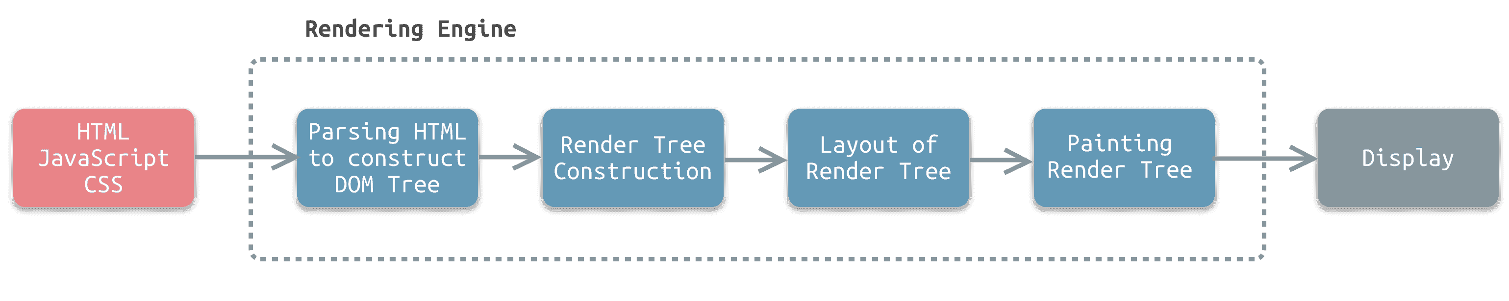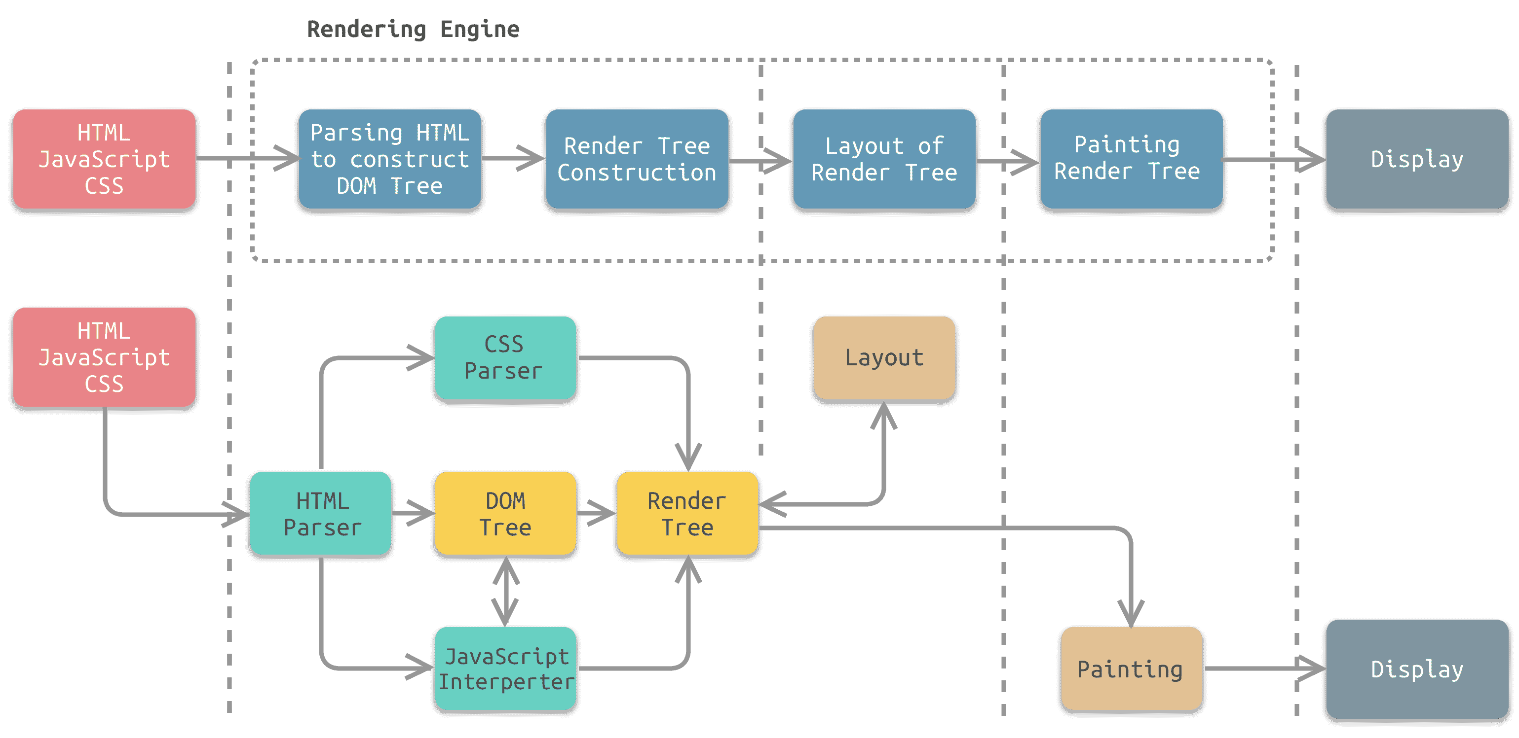 下图所示为渲染引擎工作流程中各个步骤所对应的模块,其中第1步和第2步涉及到多个模块,并且耦合程度较高。这样的设计会为了达到更好的客户体验,渲染引擎尽快将内容显示在屏幕上。它不必等到整个HTML文档解析完毕之后,即可以开始渲染树构建和布局设置。在不断接收和解决来自网络的其他内容的同时,渲染引擎会将部分内容解析并显示出来。