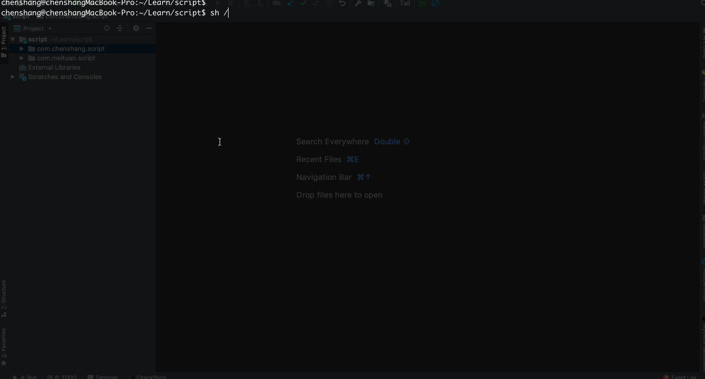 > sh $(pwd)/BaseShell/init.shproject[项目目录]:com.baseshell.learnmodule[模块名称]:Script./../../com.baseshell.learn├── BaseShell -> /Users/chenshang/shell/BaseShell└── Script ├── Resources ├── Service | └── Main.sh ├── Test ├── Utils ├── config.sh └── readme.md6 directories, 3 files
