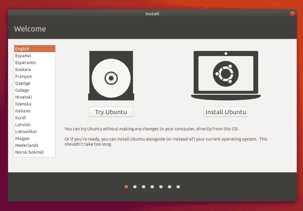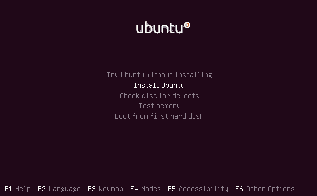 选择第二个选项“ Install Ubuntu”,而后按回车键以自动启动桌面安装程序。 或者者,选择第一个选项“不安装而尝试Ubuntu”以测试Ubuntu(与以前一样,您也可以从该模式安装Ubuntu)。