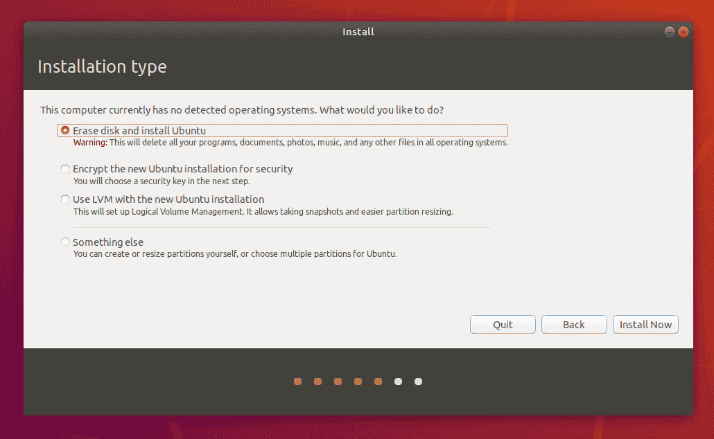 使用复选框选择能否要在其余操作系统旁边安装Ubuntu,删除现有操作系统并用Ubuntu替换,或者者(假如您是高级客户)选择“其余”选项。