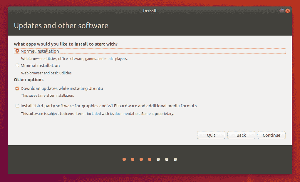 选择继续后,系统将讯问您要安装哪些应用程序?这两个选项是“正常安装”和“最小安装”。第一个等效于旧的默认实用程序,应用程序,游戏和媒体播放器捆绑包-对于任何Linux安装来说都是一个很好的启动板。第二个占用更少的存储空间,并且仅允许您安装所需的内容。
