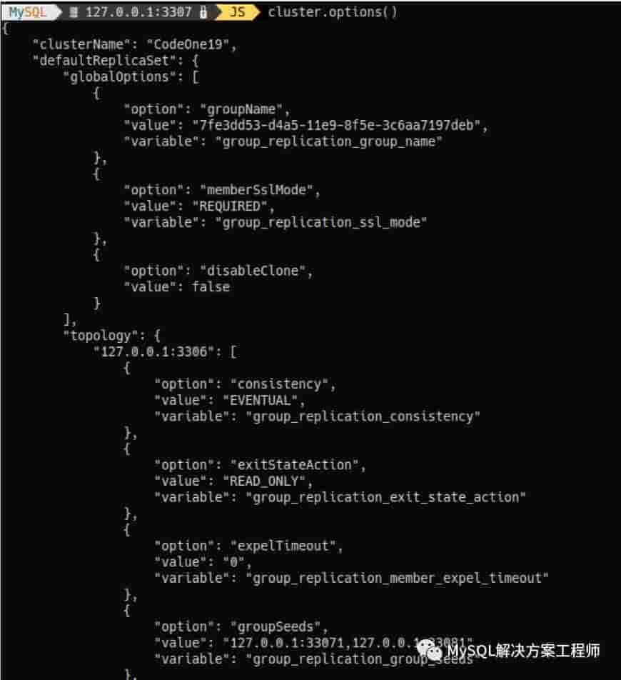执行 mysqlsh-js>cluster.options() 可以查看