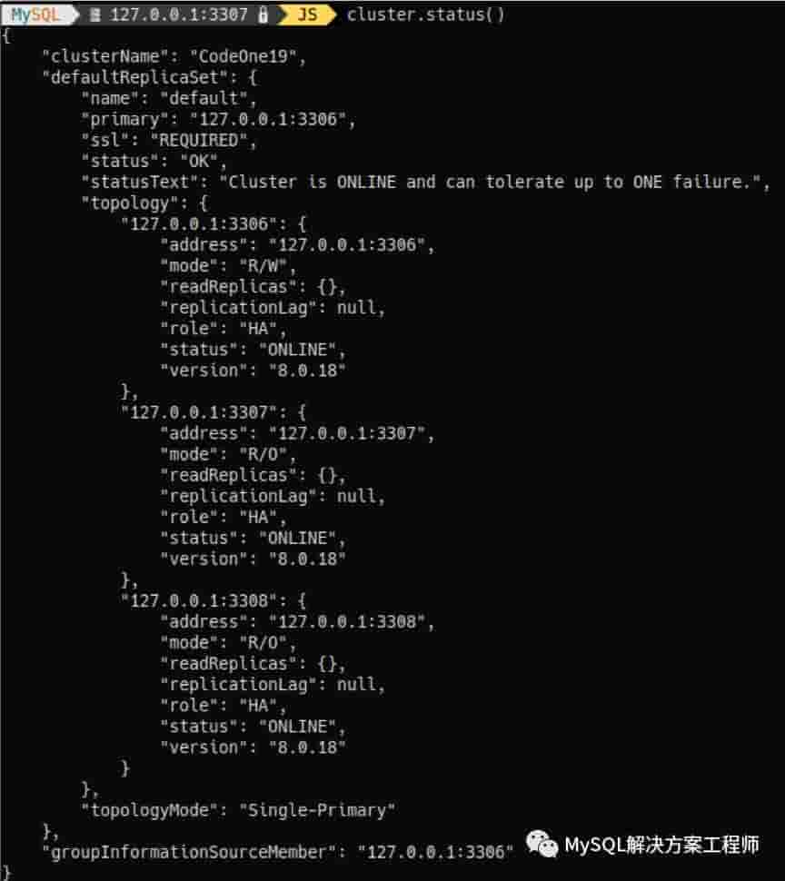 使用 mysqlsh-js>cluster.status() 可以确认集群和节点成员的状态信息: