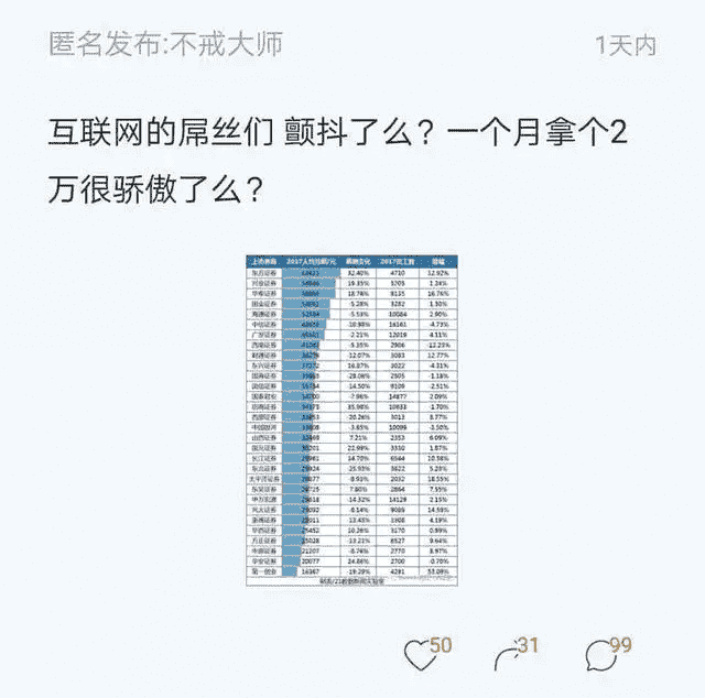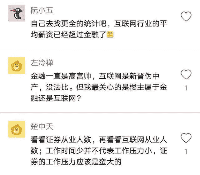 还有网友理性分析了一下:这里券商的平均薪资主要被少数经济业务干得好的老总和多数投行保代人员拉起来的。假如按资历、年龄来比,券商收入可能不如互联网,但外资投行、PE、VC、对冲基金的收入是可以吊打所有的。