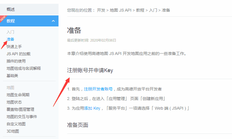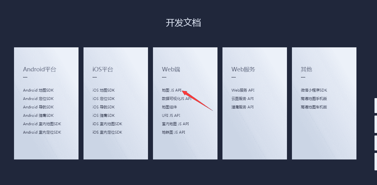 首先我们先去官网注册账号并申请key,假如我们没有这个key,地图有些功能会受到限制,所以为了能后期使用到所有功能,就申请key,那么怎样申请key呢?先去百度,搜索高德地图官网,进入高德开放平台页面,而后找到开发文档,如下图