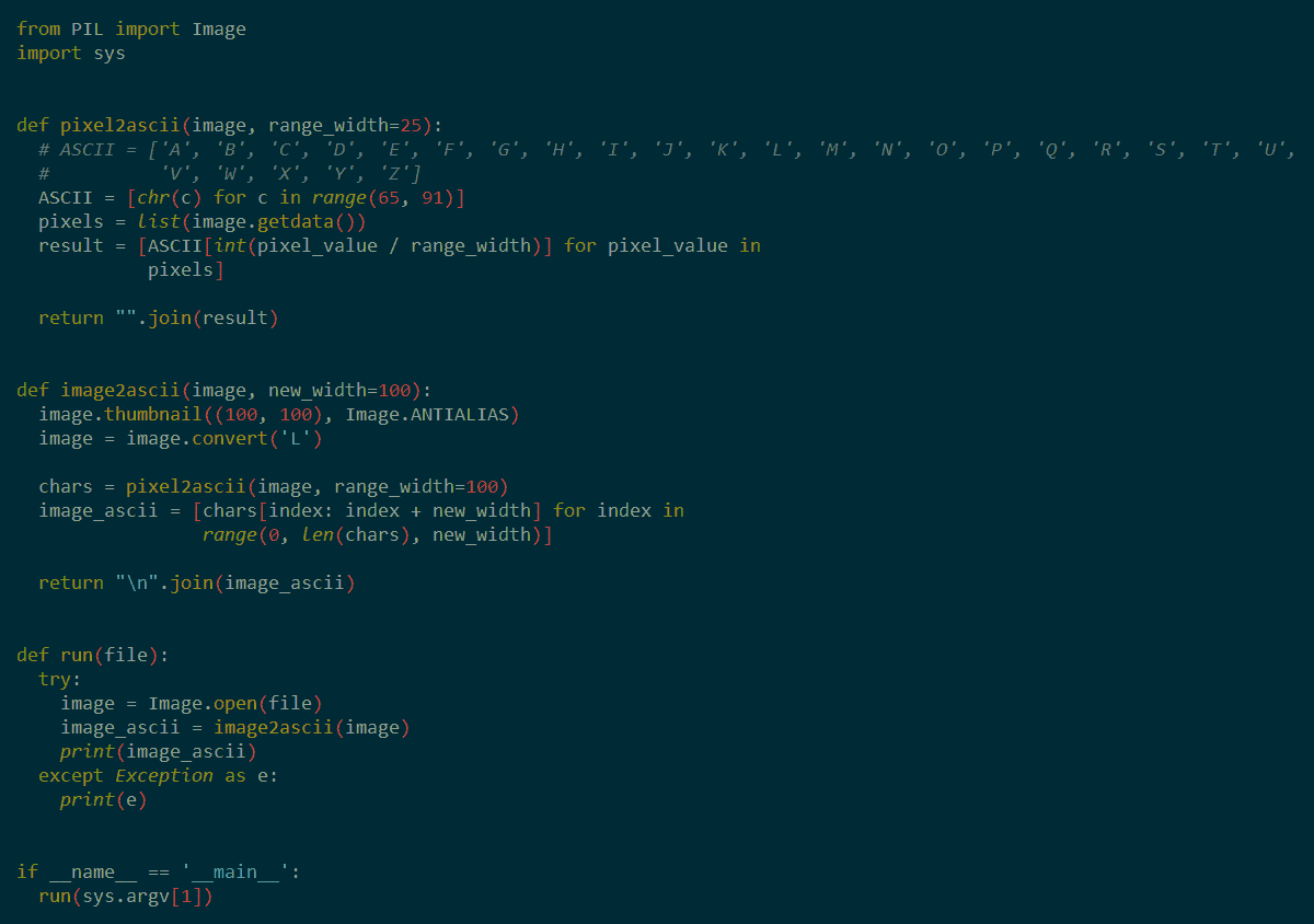 在image2ascii方法里,我们用thumbnail函数改变源图片的尺寸为宽与高为100,而后用convert转为灰度图片。
