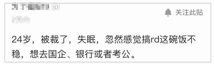 国企好还是私企好?近日有网友在某社交平台发帖,说:“24岁,被裁了,失眠,突然感觉搞rd这碗饭不稳,想去国企、银行或者者考公。”