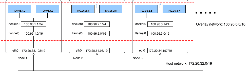 flannel覆盖网络可以看到有3个node,在多个node上建立一个覆盖网络,子网网段是100.95.0.0/16,而后,最终到容器级别,每个容器在这个网段里面获取到一个独立的ip。而宿主机所在的局域网络的网段是172.20.32.0/19