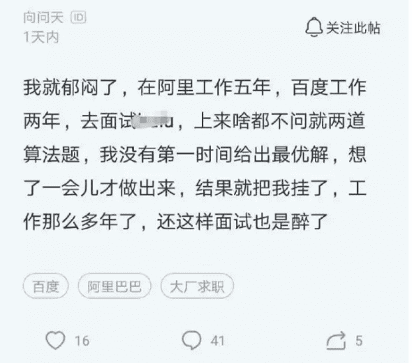 ”我就郁闷了,在阿里工作五年,百度工作两年,去面试某公司,上来啥都不问,就两道算法题我没有第一时间给出最优解,想了一会儿才做出来,结果就把我挂了,工作那么多年了,还这样面试也是醉了。“