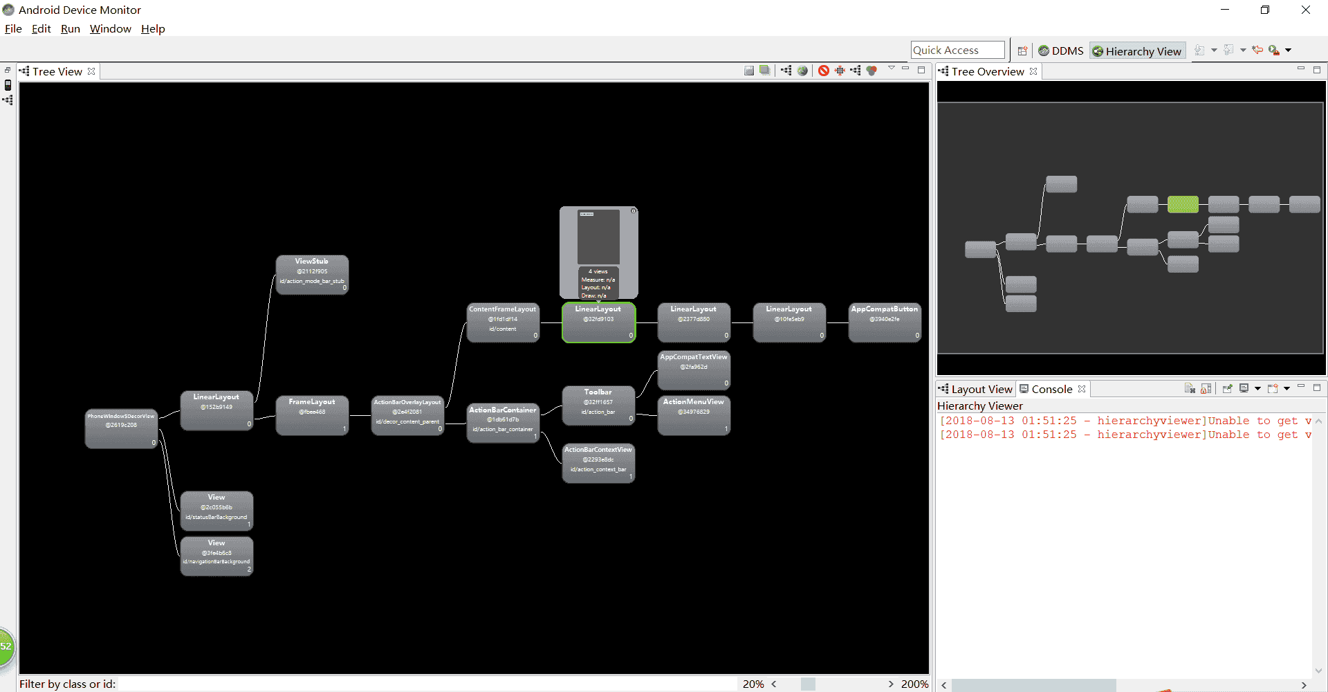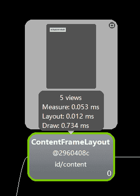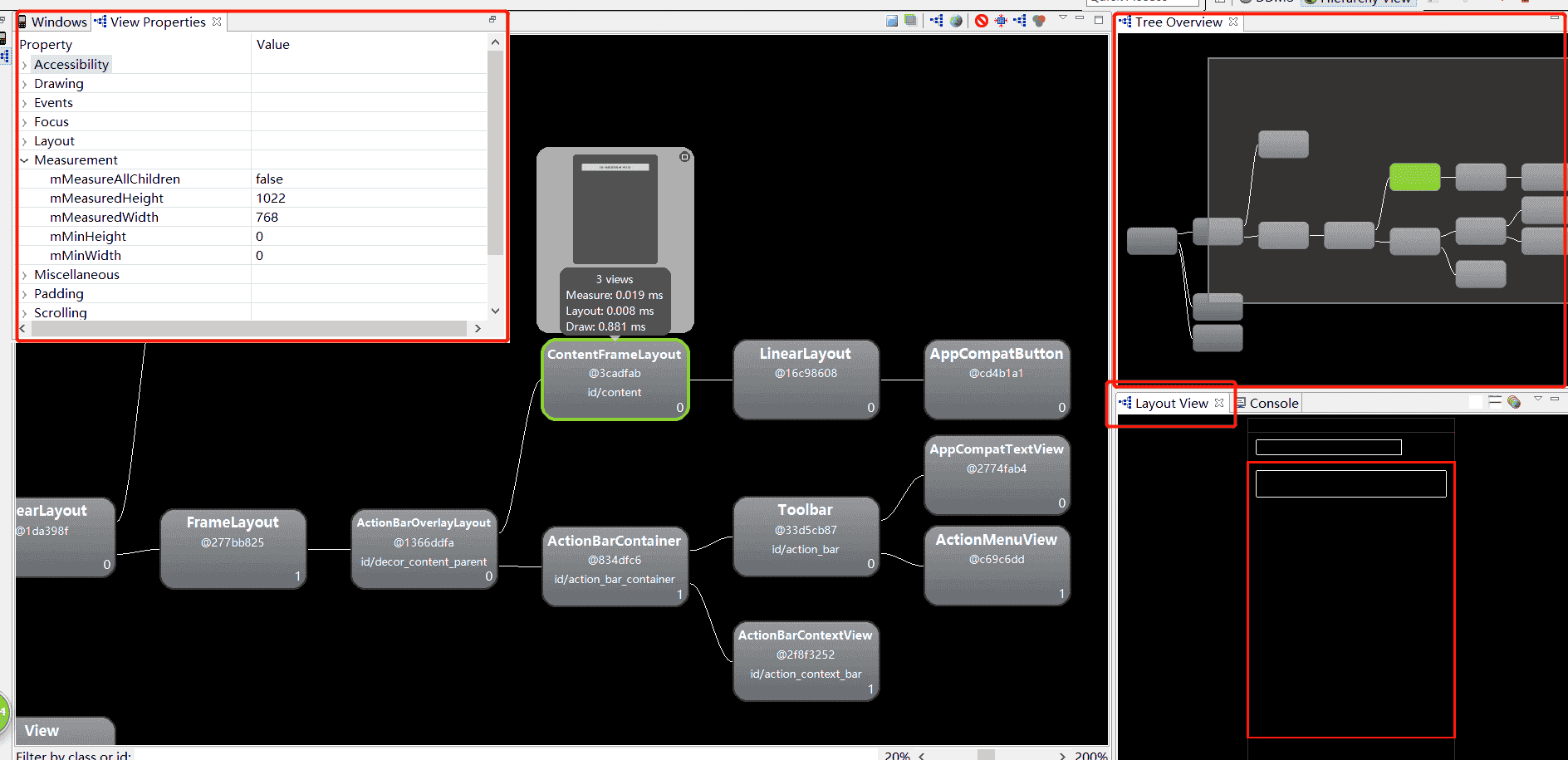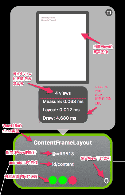 通过Hierarchy Viewer工具,即可以很快地在视图树中找到冗余的布局,从而有目的地优化布局。同时,Hierarchy Viewer工具还可显示很多有用的信息,如下如: