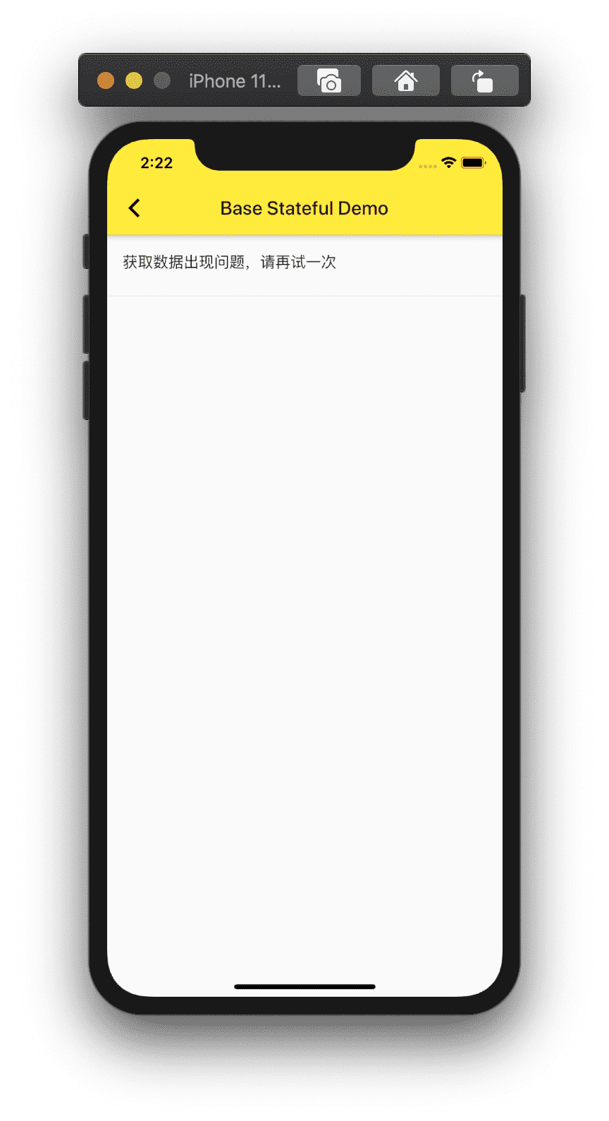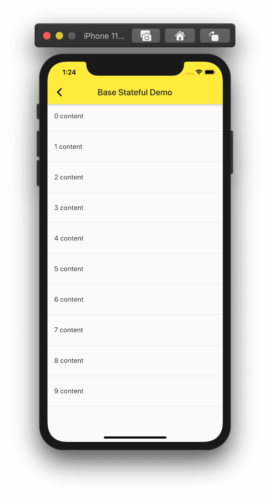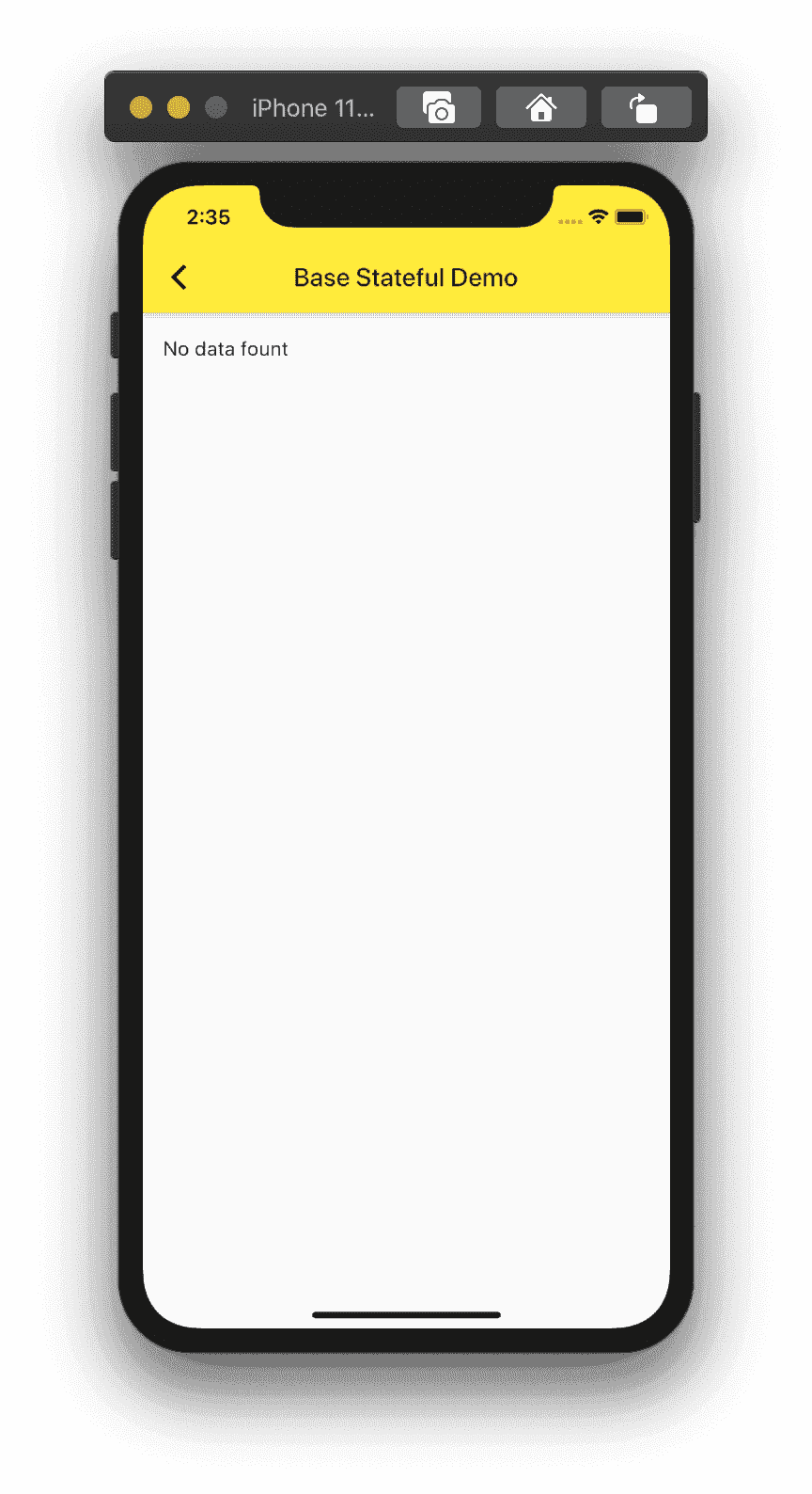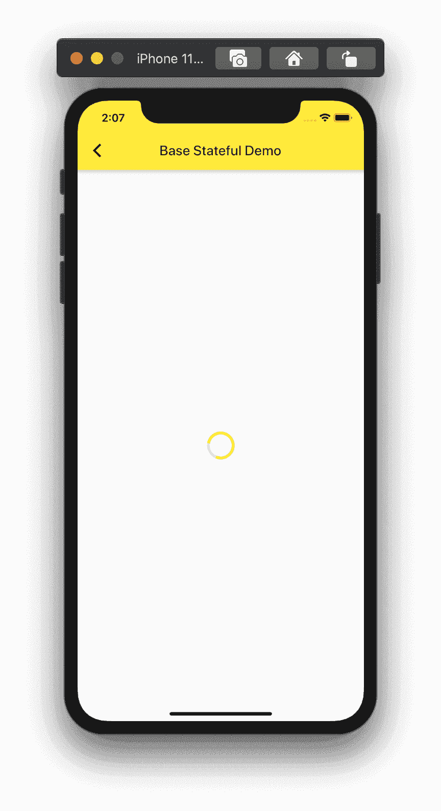bool get _fetchingData => _pageData == null; // 判断数据能否为空 @override Widget build(BuildContext context) { return Scaffold( appBar: AppBar( title: Text('Base Stateful Demo'), ), body: _fetchingData ? Center( child: CircularProgressIndicator( // 加载指示器 valueColor: AlwaysStoppedAnimation<Color>(Colors.yellow), // 设置指示器颜色 backgroundColor: Colors.yellow[100], // 设置背景色 ), ) : ListView.builder( itemCount: _pageData.length, itemBuilder: (buildContext, index) { return getListDataUi(index); }, ), ); }