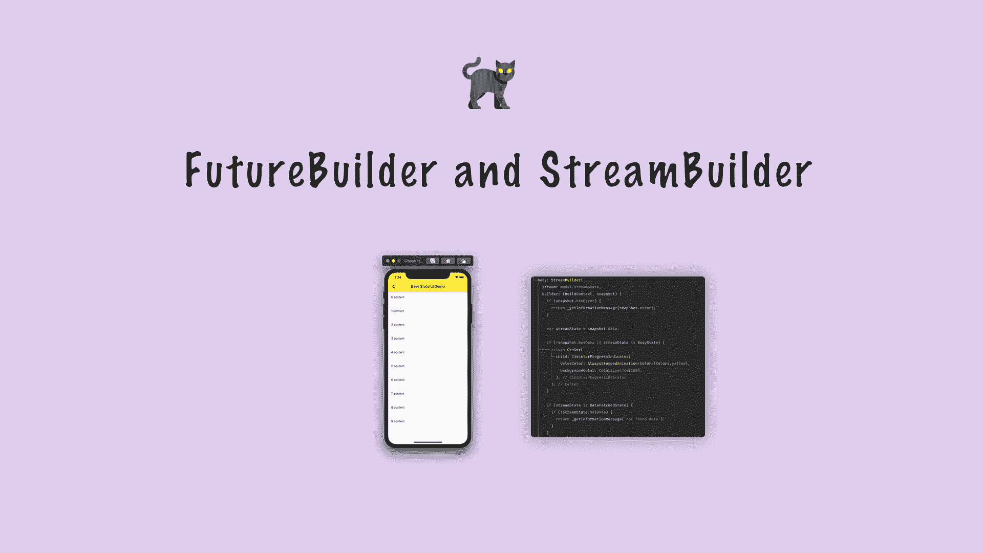 @override Widget build(BuildContext context) { return Scaffold( appBar: AppBar( title: Text('Stream Builder Demo'), ), floatingActionButton: FloatingActionButton( backgroundColor: Colors.yellow, child: Icon( Icons.cached, color: Colors.black87, ), onPressed: () { model.dispatch(FetchData()); }, ), body: StreamBuilder( ... ), ); }