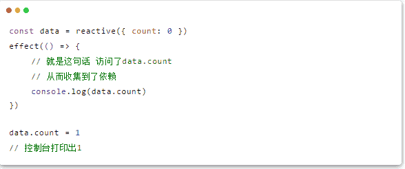 响应式数据的核心api,这个api返回的是一个proxy,对上面所有属性的访问都会被劫持,从而在get的时候收集依赖(也就是正在运行的effect),在set的时候触发升级。