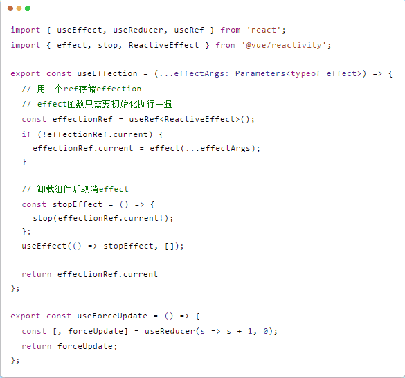 从这几个核心api来看,只需effect能接入到React系统中,那么其余的api都没什么问题,由于它们只是去收集effect的依赖,去通知effect触发升级。