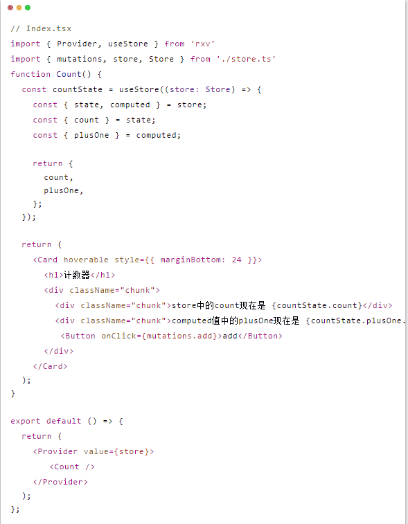 可以看出,store的定义只用到了@vue/reactivity,而rxv只是在组件中做了一层桥接,连通了Vue3和React,而后我们即可以尽情的使用Vue3的响应式能力啦。