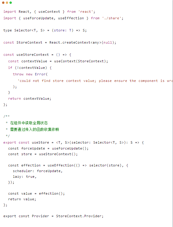 因为需要准确的收集依赖全靠useStore,所以selector函数肯定要准确的访问到你关心的数据。甚至假如你需要触发数组内部某个值的升级,那你在useStore中就不能只返回这个数组本身。