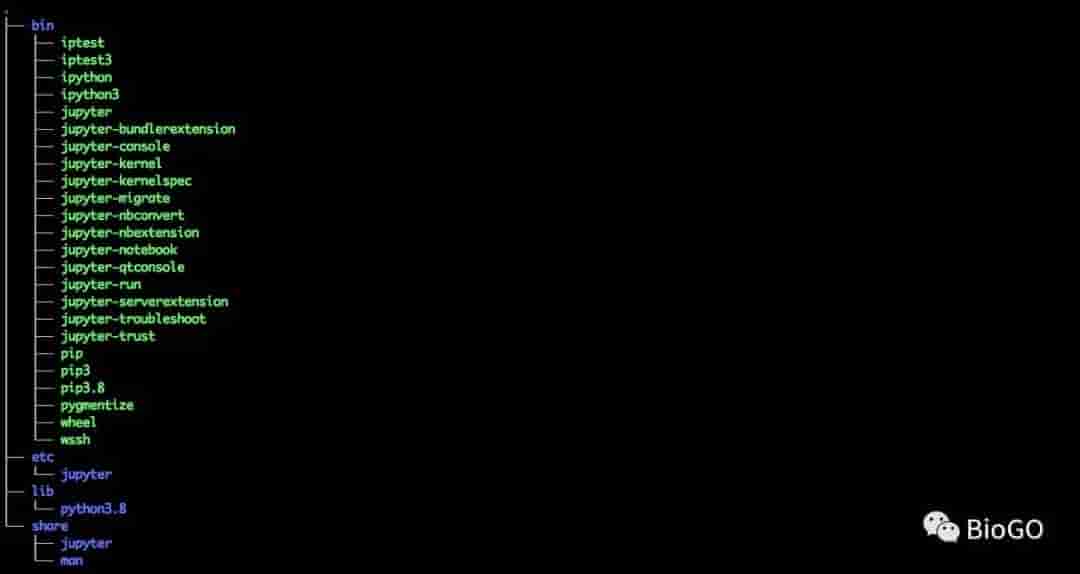 其中bin、etc、lib、share是属于该目录下的第一级目录, iptest等高亮的文件属于bin目录下的可执行文件,jupyter(etc)、python3.8、jupyter(share)、man则是一级目录下的子目录。这些目录的作用接下来将会详情。