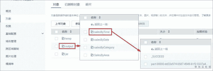 5. 作业完成后,可在OBS桶内看到output文件夹,里面有四个文件夹,每个文件夹内有一个“_SUCCESS”文件和一个“part”开头的csv文件。