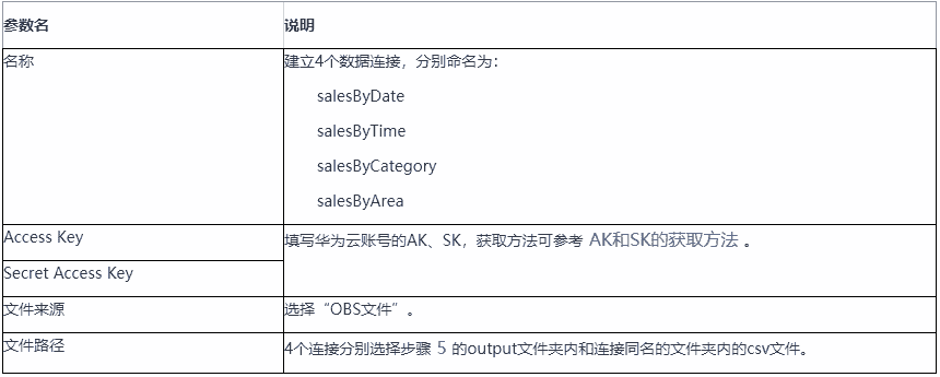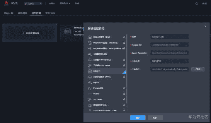 8. 单击“我的数据 > 新建数据连接” ,在“新建数据连接”页面左侧的数据库类型中,选择“CSV文件”,按照下表的数据规划填写配置后单击“确定”。重复本步骤建立4个数据连接。
