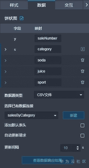 配置 “s”为 “category”, “y”为 “saleNumber”,并设置各个分类的名称(本示例中为“soda”,“juice”,“sport”)和图例的颜色。