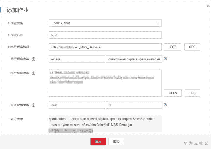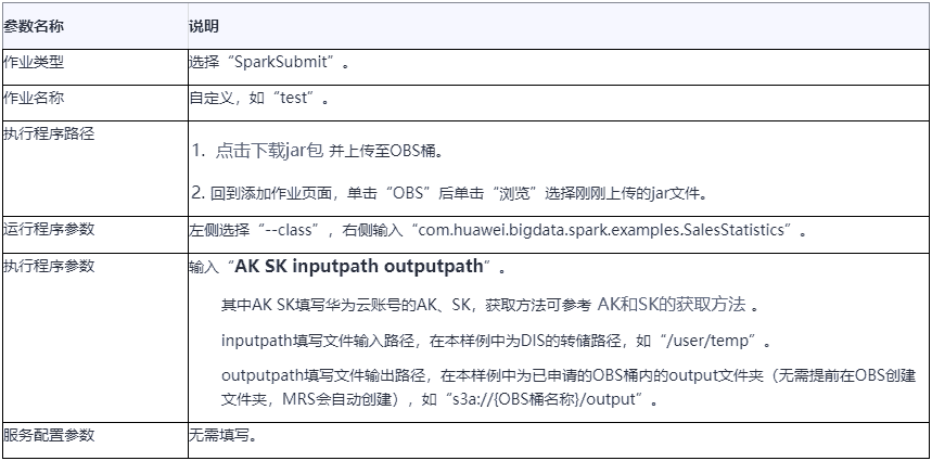 4. 单击页面上方的“作业管理”,在“作业”页签中单击“增加”,配置作业信息。本示例中创立一个spark类型的作业,实现分析设施上报数据,分别按日期、时间段、种类、区域统计销量,将分析结果输出为CSV文件并保存至OBS。