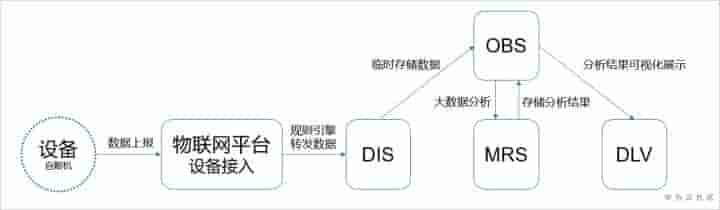 华为云物联网平台提供规则引擎能力,支持将数据上报的数据转发至华为云其余云服务,可实现将海量数据通过数据接入服务(DIS)转发至MapReduce服务(MRS),对数据进行解决后再由数据可视化服务(DLV)读取数据呈现为可视化报表,实现数据的一站式采集、解决和分析。