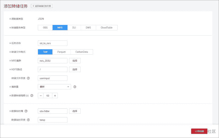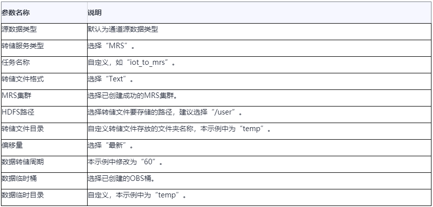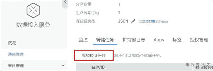 创立通道并配置转储任务,实现将设施管理服务传入DIS的数据转发至MRS。
