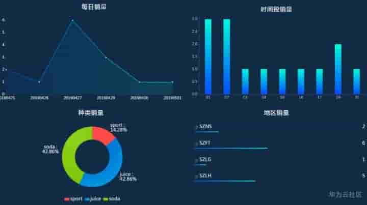 10. 重复以上步骤再增加一个标题为“时间段销量”柱状图,一个标题为“种类销量”的饼状图,一个标题为“地区销量”的区域排行图,并根据自己的需要设置图表的样式。最终效果相似下图。
