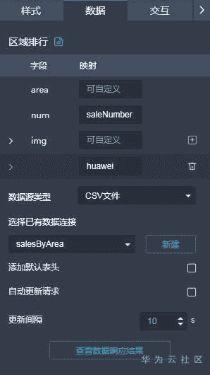 16. 选中“地区销量”表,在右侧数据面板选择数据类型为“CSV文件”,数据连接选择步骤8增加的数据连接“salesByArea”。