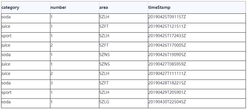 上述样例表示UTC时间2019年4月25日9点11分57秒深圳罗湖的自动贩卖机销售了一支苏打饮料。
