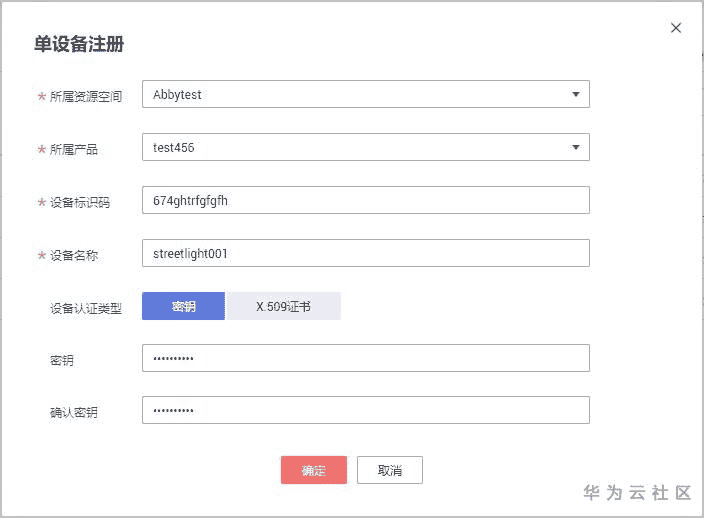 填写完成后单击“确定”,请注意保存注册成功返回的“设施ID”和“设施密钥”。