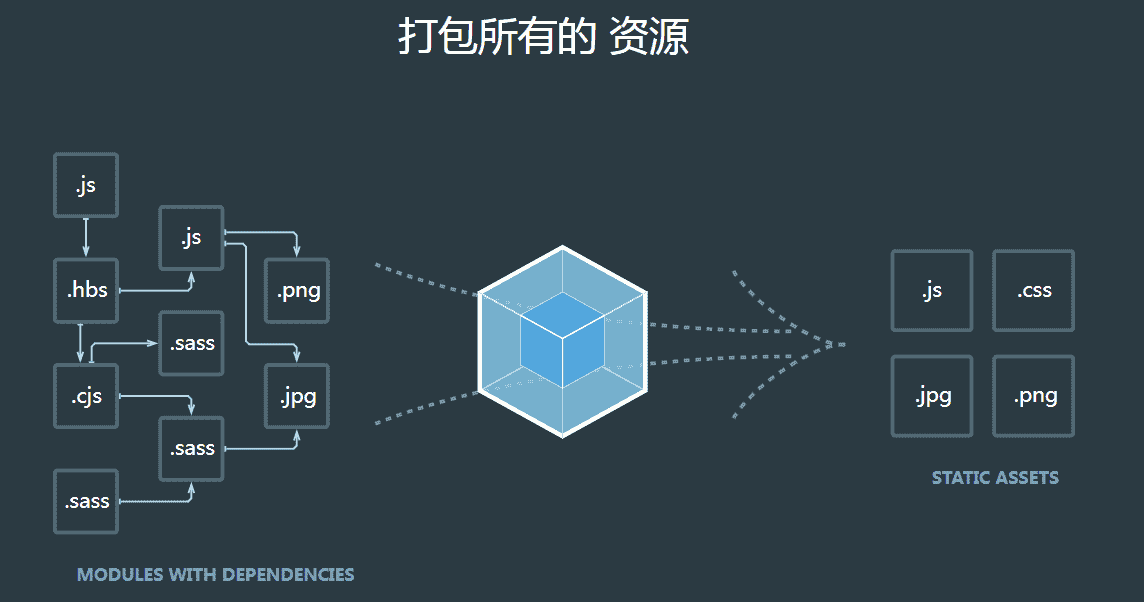 Webpack 官网开始的首页,就已经形容了它的工作原理。在 Webpack 的思想中,像 JS、CSS、图片、字体等,都属于一个模块。Webpack 可以通过打包,将它们最终聚集到一起。