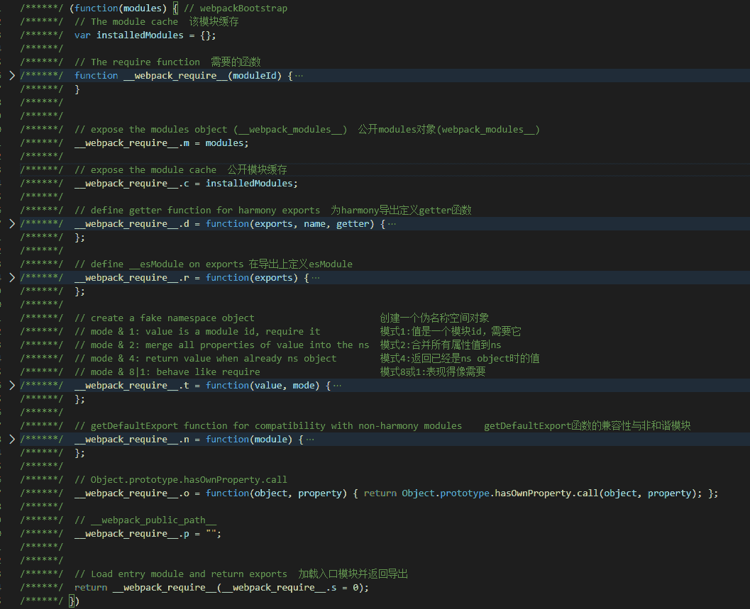 最开始定义了一个 installedModules 对象用于存放或者者缓存加载过的模块,而后定义了一个 require 函数(这个函数是用来加载模块的),再往后就是在 require 函数上挂载了少量其余的数据和工具函数。