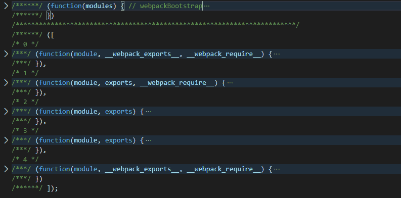 整体生成的代码其实就是一个立即执行函数,这个函数是 Webpack 工作入口(webpackBootstrap),它接收一个 modules 参数,调用时传入了一个数组。