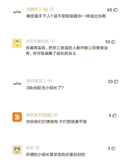 楼主身为小组长才拿28K,手下的人却能拿到35K,楼主很沮丧,问广大网友“怎样办”。网友们却不怎样买账,许多人质疑他究竟是不是小组长,没准小组长只是楼主自己封的,有权力开除人吗?有权力给别人打绩效吗?