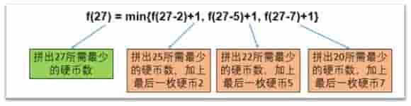 至此,通过找到原问题最后一步,并将其转化为子问题。为求面值总额27的最小的硬币组合数的状态就形成了,用以下函数表示: