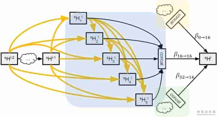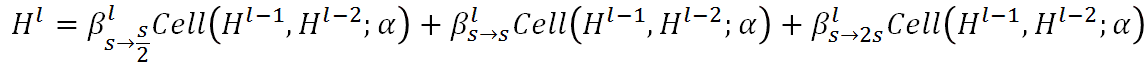Auto-DeepLab定义了12个cell,而上图(左)中前面两个白色的node是固定的两层为了缩小spatial resolution。如图左灰色箭头所示,正式搜索之后,每一个cell的位置都有多种cell类型可以选择:可以来自于当前cell相同的spatial resolution的cell,也可以是比当前cell的spatial resolution大一倍或者小一倍的cell。作者将这些空间路径(灰色箭头表示的路径)也赋予一个weight,记作Beta。如图右,每一个cell的输出都是由相邻spatial resolution的cell结合而成,而Beta的值可以了解成不同路径的probability。为了更直观,我们把图右的三个cell分别用蓝色,黄色和绿色标注,对应图左的三个cell。与DARTS相似,我们将operation的parameters记作W,将cell内部operation的权重记作Alpha。所以搜索最优网络结构,即迭代计算并升级W,Alpha和Beta。文中给出每一个cell的实际输出为: