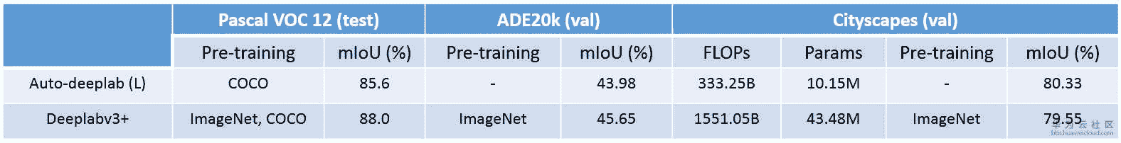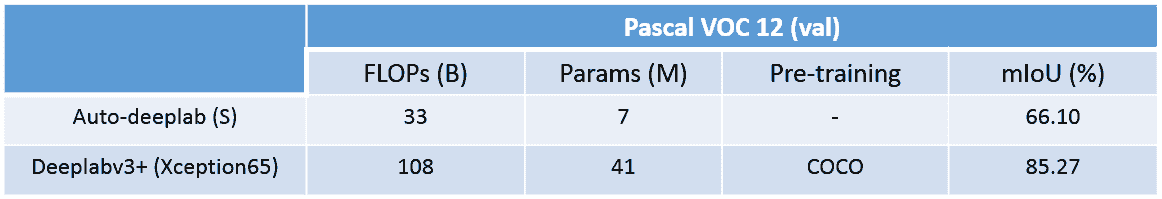 除了文中给出的试验结果以外,我们在PASCAL VOC 12数据上从零开始训练了Auto-DeepLab,用代码中给出的模型结构,并且与DeepLabv3+(xception65)进行结果比照。但是并不是所有结果都能复现,分析起因大概是这样:首先,上文中给出的模型结构是用Cityscapes数据集搜索得到,也许在PASCAL VOC 12上并不是最优解;其次没有用ImageNet做pre-training,训练环境也不同。我们在下面表格中比照了FLOPs, 参数数量, 在K80 GPU上面的fps和mIoU。