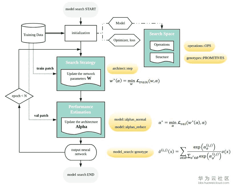 DARTS将每对node之间的每一个operation都赋予一个weight,最优解可以用softmax求得,也就是说有最大probability的path代表最优operation,这也是DARTS的核心部分。DARTS在搜索空间中定义了两种cell,reduction cell和normal cell。宏观网络结构是固定的,作者采用了简单的chained-structured,将reduction cell放在了网络结构的1/3和2/3处。所以说在搜索的过程中,cell内部不断升级而宏观结构没有变化。我们定义operation的参数为W,将cell中operation的weight记为Alpha。根据论文和source code,我们总结了DARTS的搜索流程如下图。