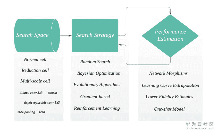 接下来我们简单详情一下NAS的流程,详细内容可参考【2】。NAS的架构主要包含三部分:搜索空间Search Space,搜索策略Search Strategy和评估机制Performance Estimation(如下图)。