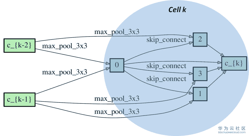 正如前文中提到,多数的NAS网络会搜索不同类型的可重复的cell,而后将cell连接起来构成神经网络。这个cell通常用directed acyclic graph(DAG)表示。一个DAG cell包含N个有顺序的node,每一个node可以看成在它前面所有node的结合(就像feature map一样是一个latent representation)。从node i 到node j的连接是某一种operation记作o(i,j). 每一个cell都有两个input node和一个output node。下图中是一个DARTS展现的reduction cell。我们可以看到cell k 有两个input nodes 分别是c_{k-1}和c_{k-2} (来自cell k-1和cell k-2的output node),cell k包含了4个immediate nodes和一个output node c_{k} 。o(i,j)是边缘上的max_pool_3x3,max_pool等。理论上从一个node到相邻的node可以有很多种operation,所以搜索最优网络结构也可以看成是选择每一个边上最佳的operation。