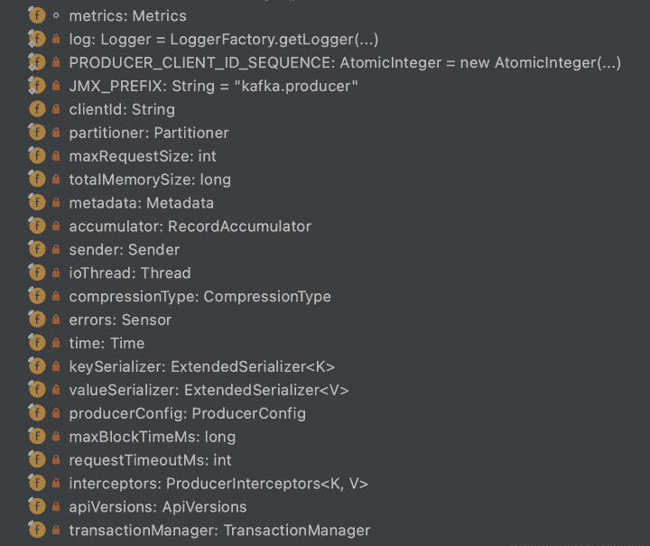 首先看一眼 KafkaProducer 类中有哪些成员变量,这些变量就是 Producer 的核心组件。