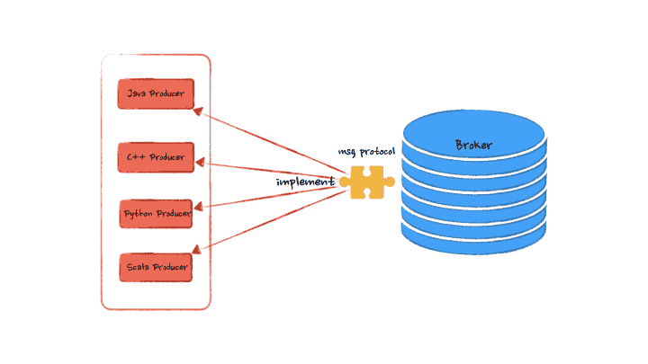前面提到 Kafka 帮我们实现了各个版本的生产者代码,其实他也可以完全不提供这份代码,由于核心的队列的功能已经实现了,这些用户端的代码也可以完全交由客户自己实现。