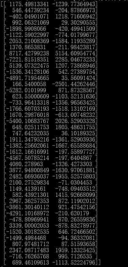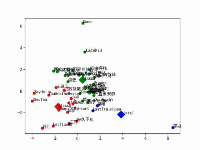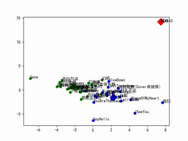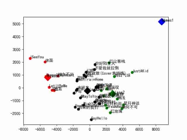 综上所述,我们已经取得了歌曲的42个特征值。下面我们尝试利用这些特征值对我这几天下载的43首歌曲进行k均值聚类。首先,为了便于结果的可视化,我们利用PCA对数据进行降维(42维特征到2维特征),为了方便起见,我们直接调库(sklearn)实现,结果打印如下: