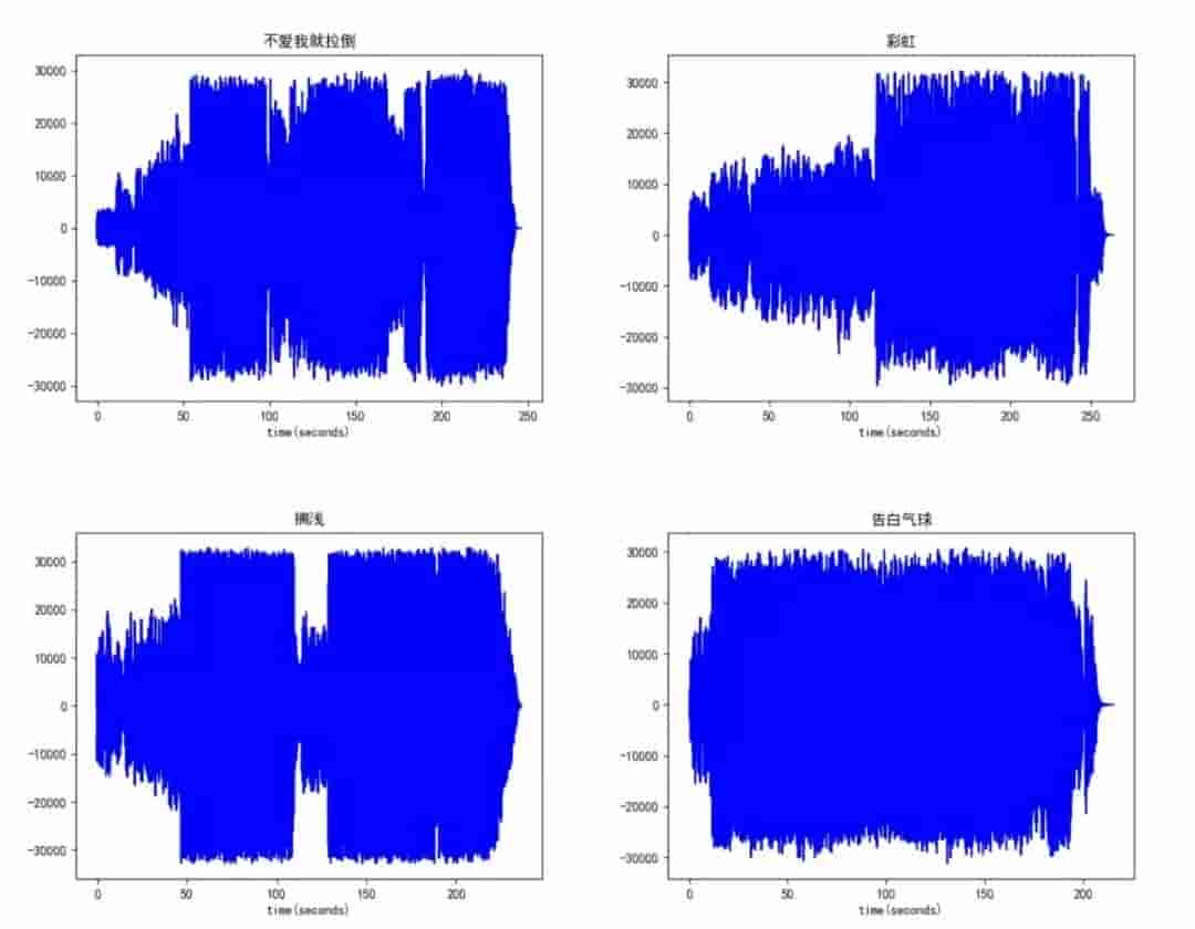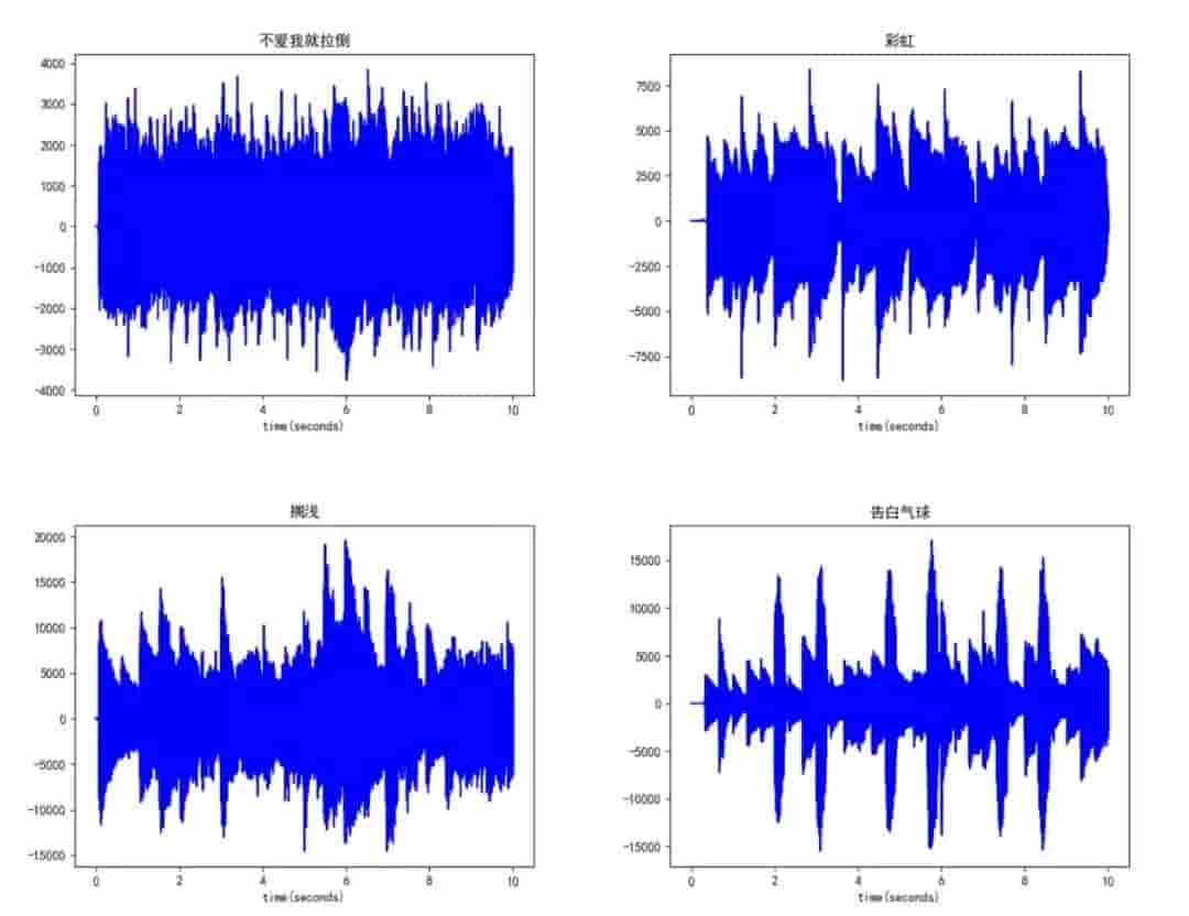 感觉波形图好混乱,似乎是数据量太大引起的,于是我打算换一个策略,只画出每首歌曲前10秒的波形图来作比较,毕竟良好的开端是成功的一半?