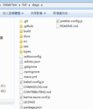 参数必需跟在 – 后面,表示对所有分支进行操作。假如你只想保存当前分支,也可以不增加此参数。此操作会花点时间,执行完成,可以看到,原版的 dayjs 下的文件,变成了这样: